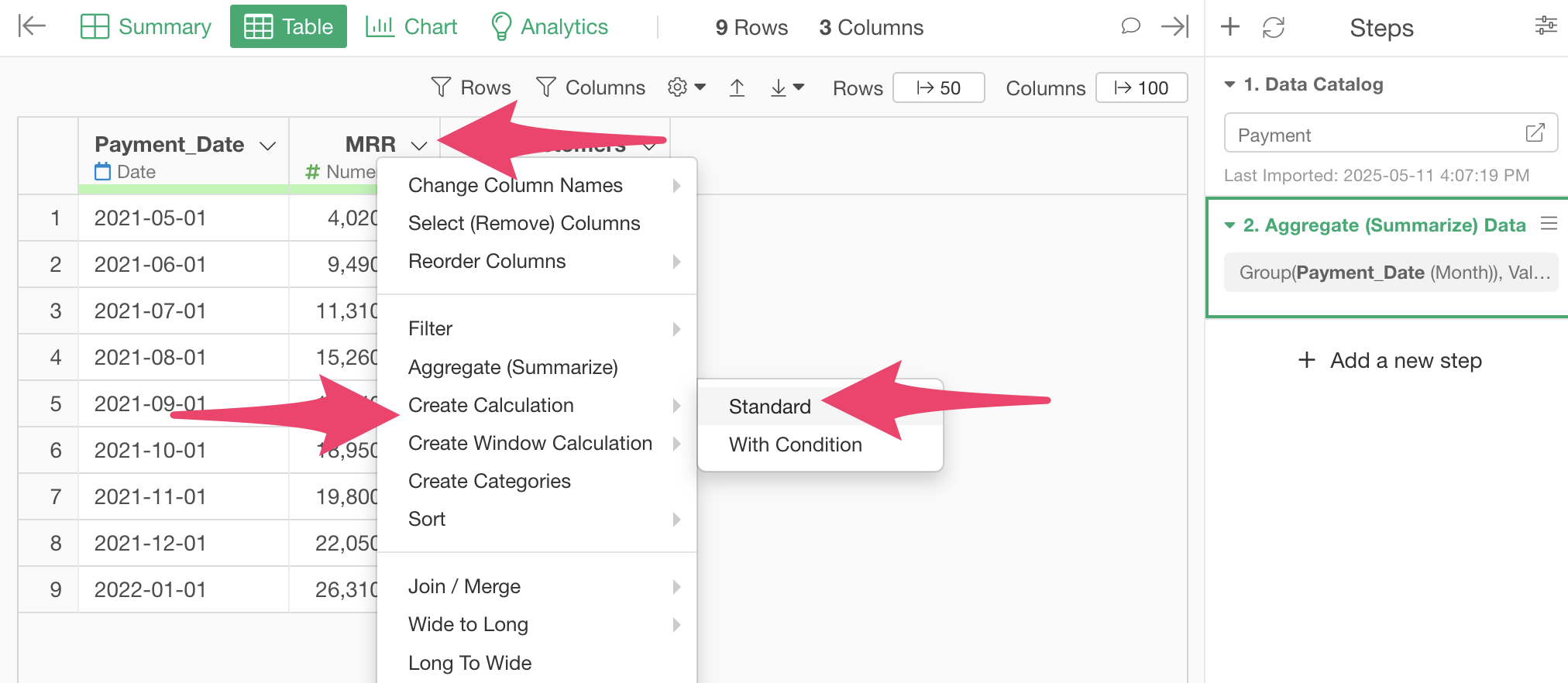 Finally, to calculate ARPU, select “Create Calculation”, “Standard” from the MRR (or ARR) column header menu.