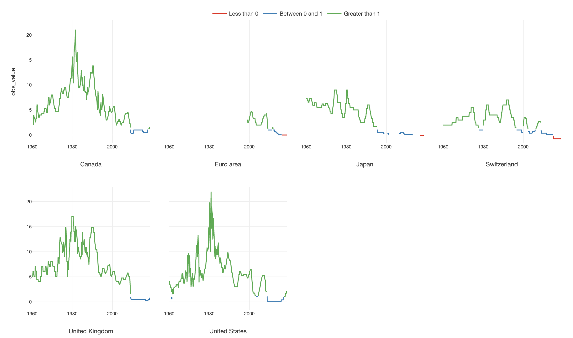 And here it is. The history of the interest rates for the 6 developing countries and regions are visualized with 3 colors highlighting when they went to the negative, if any.