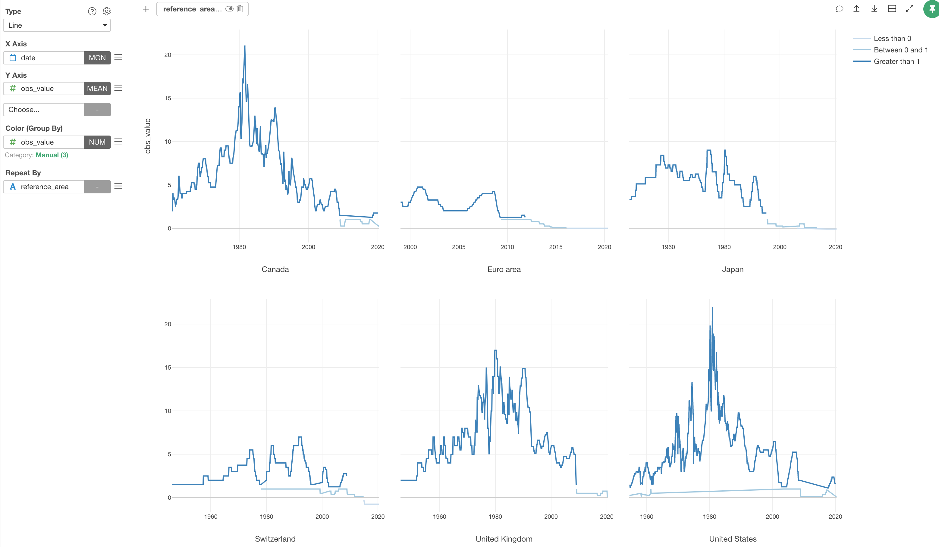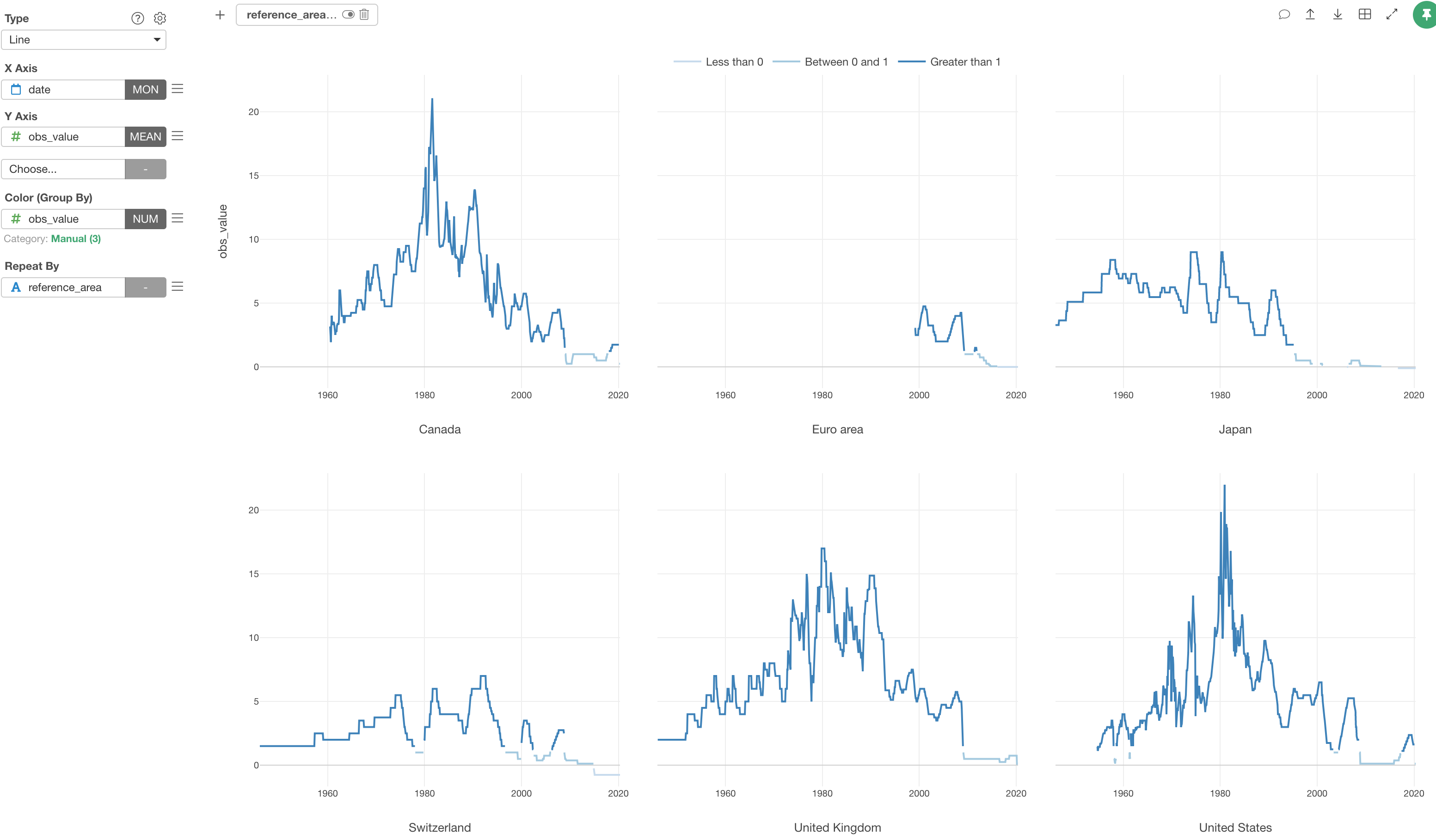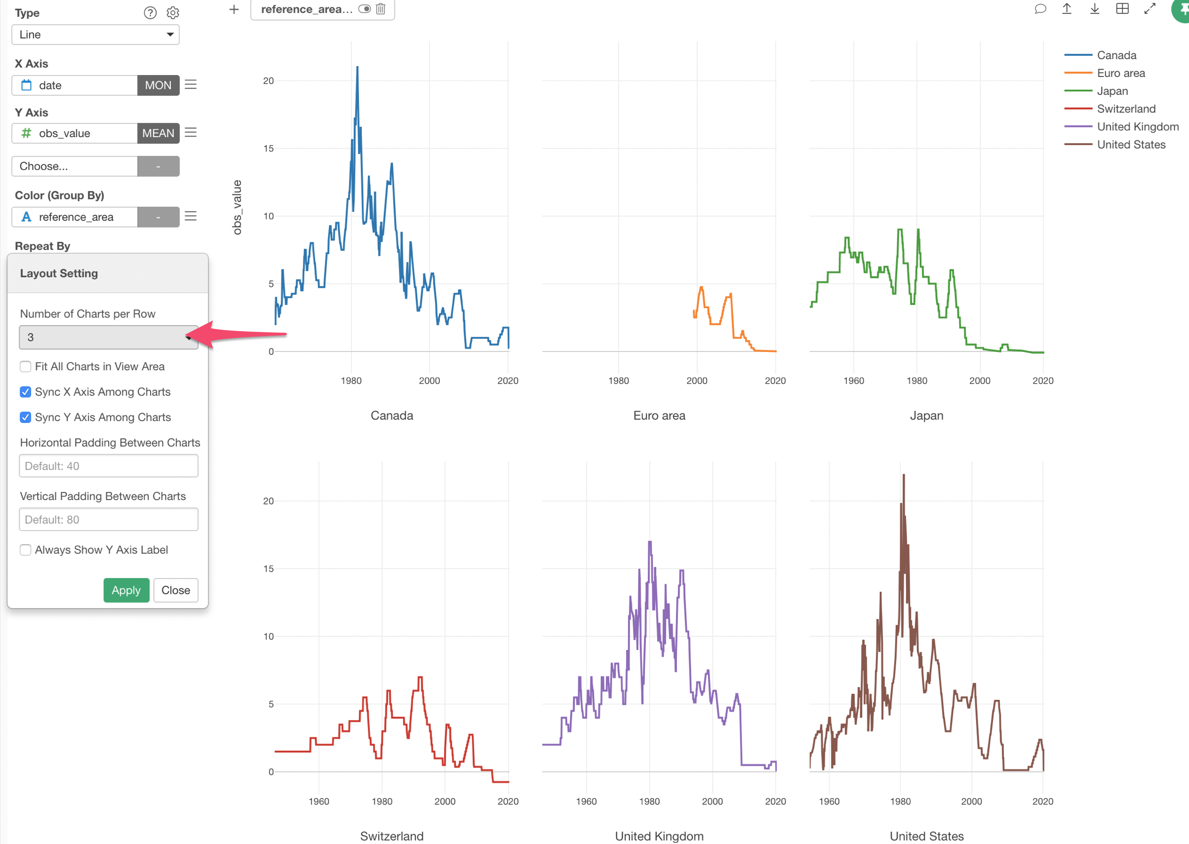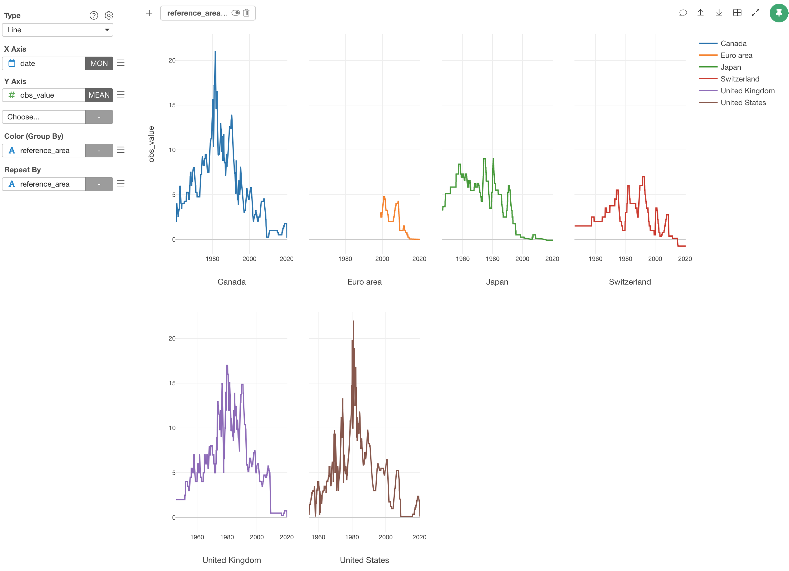 We can separate it into 6 different charts, each of which represents each country or area, by using Repeat By.