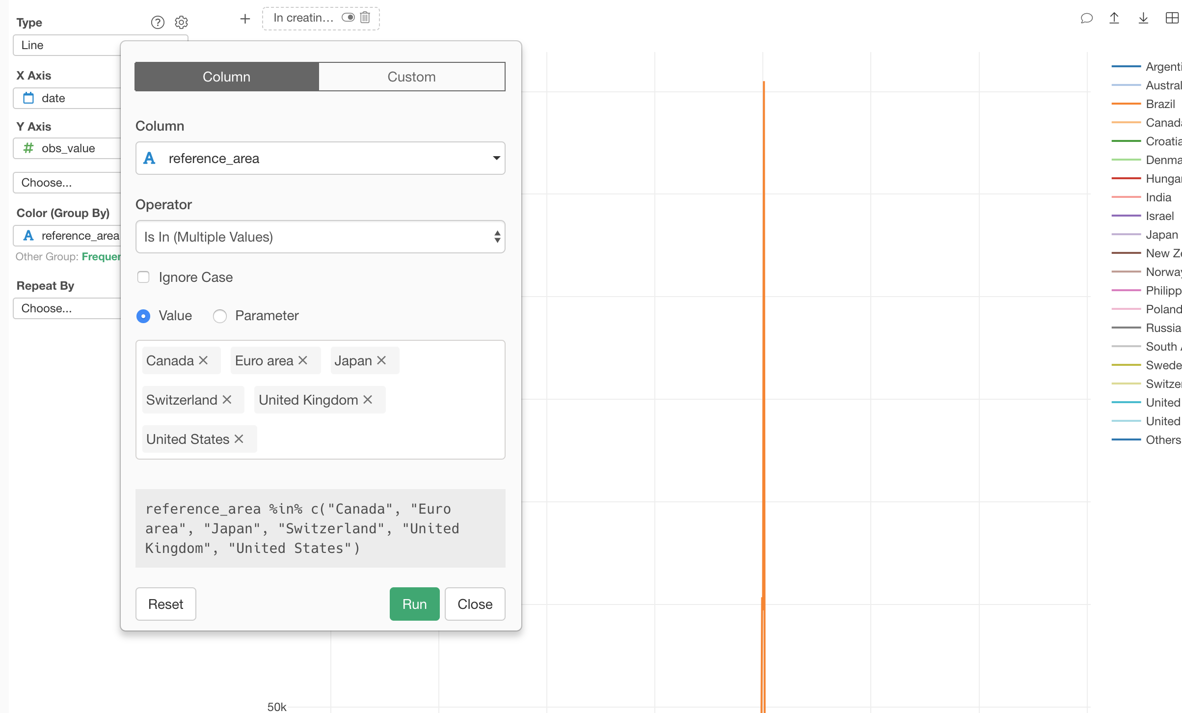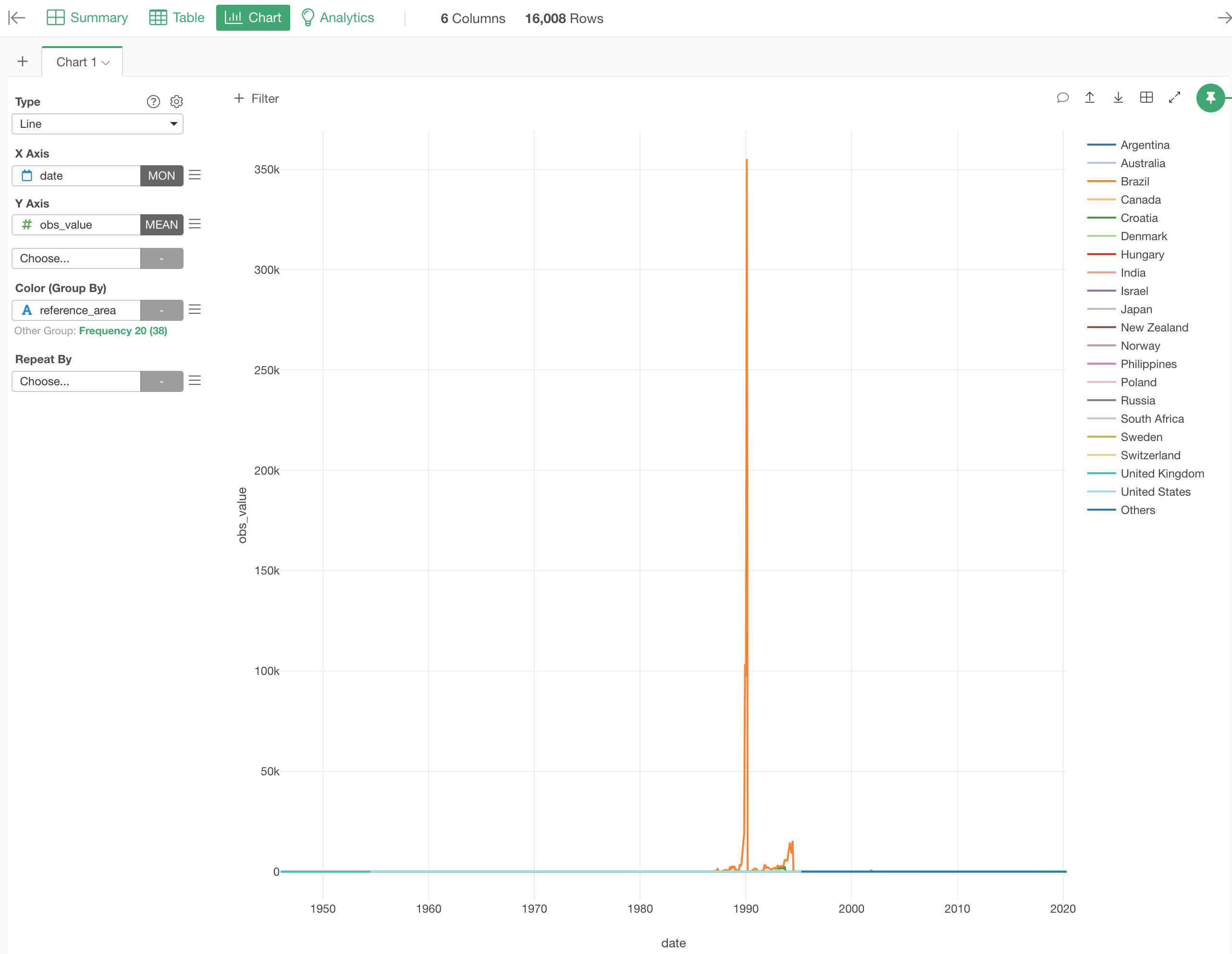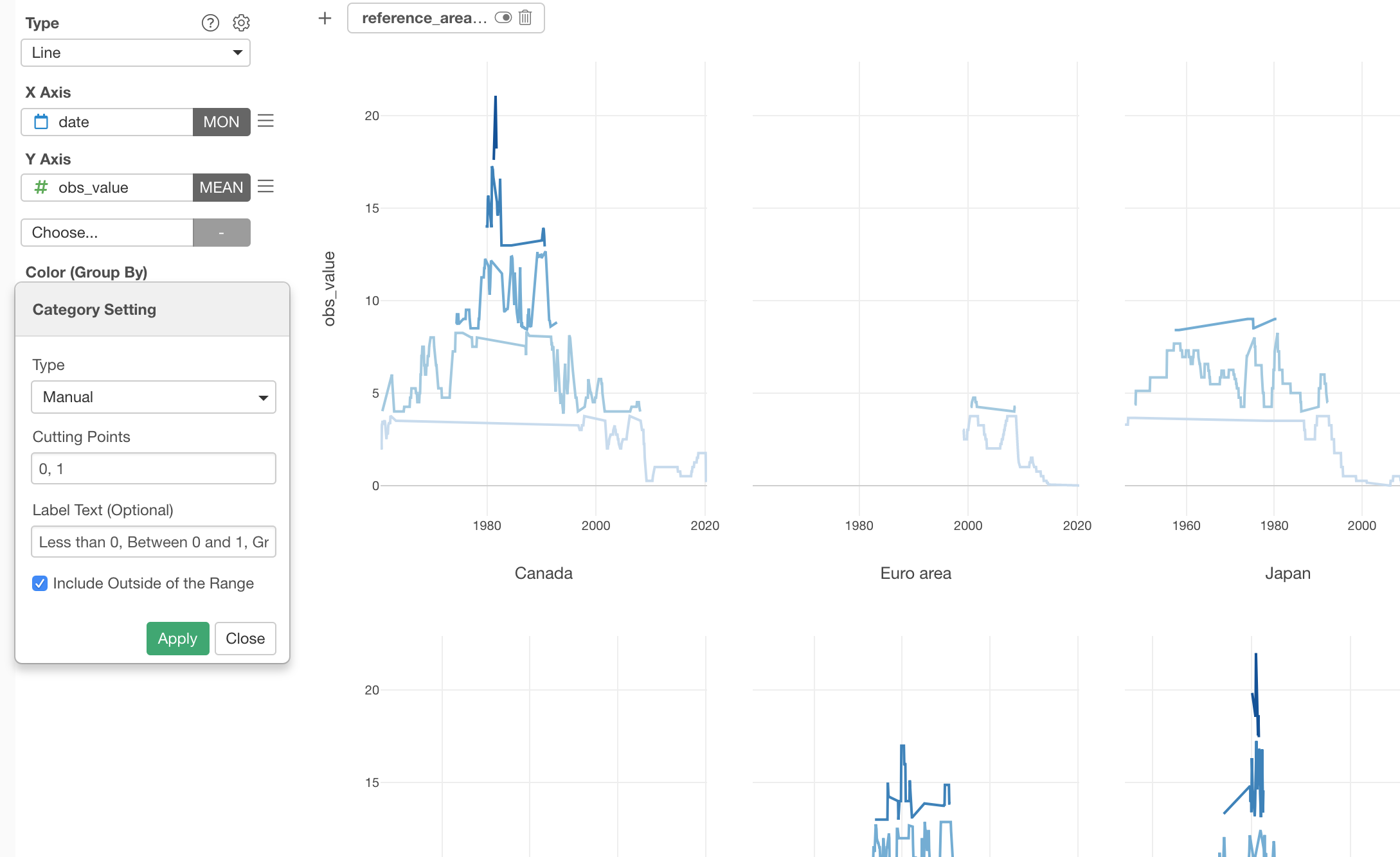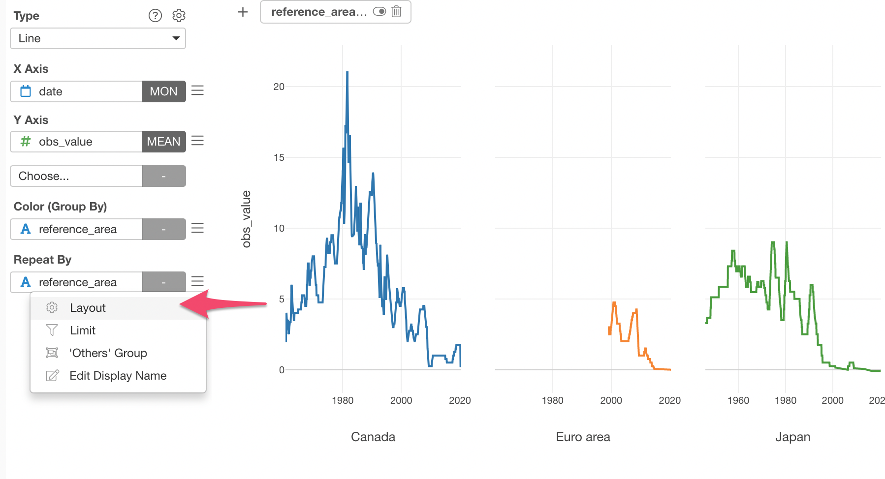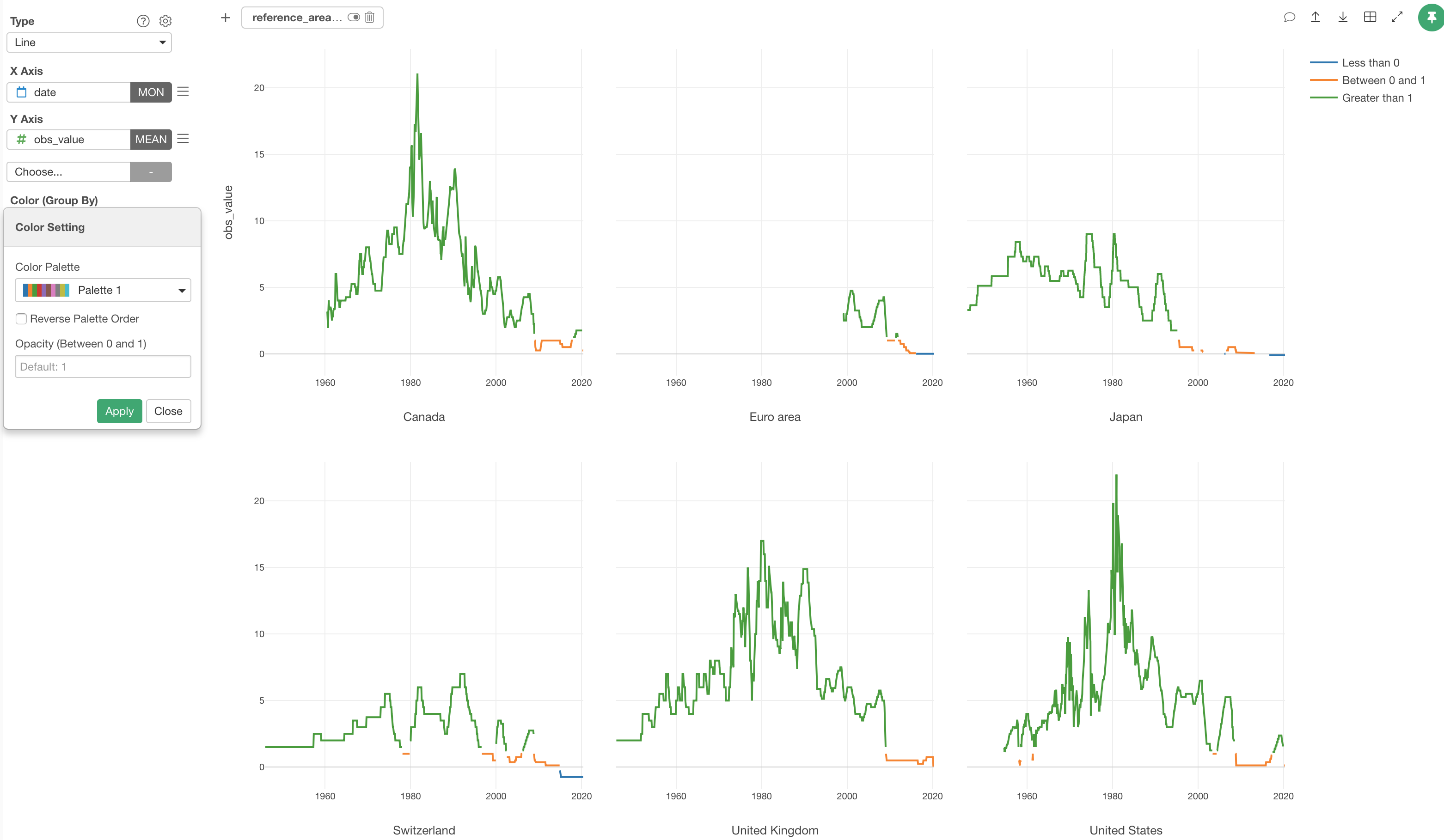 We can separate it into 6 different charts, each of which represents each country or area, by using Repeat By.