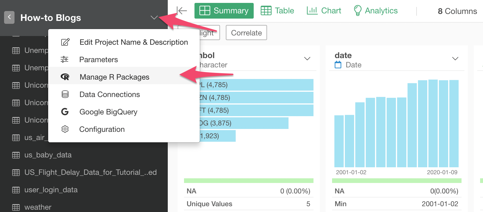 Select ‘Manage R Packages’ from the Project level menu.