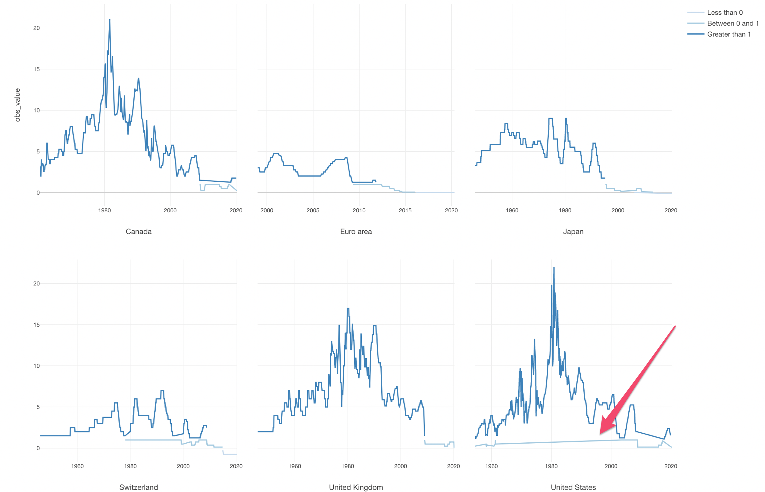 We can see the interest rates being negative in Japan and Switzerl and 0 in Euro in the recent years.