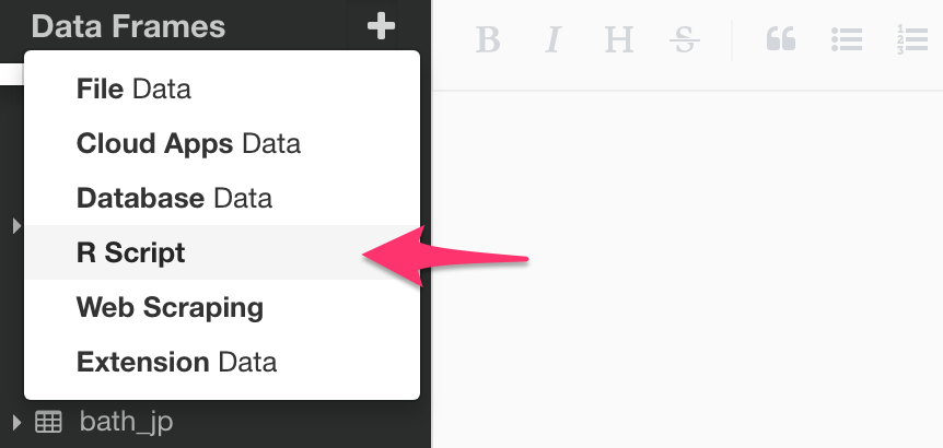 Select ‘R Script’ from Data Frame menu at the left hand side.