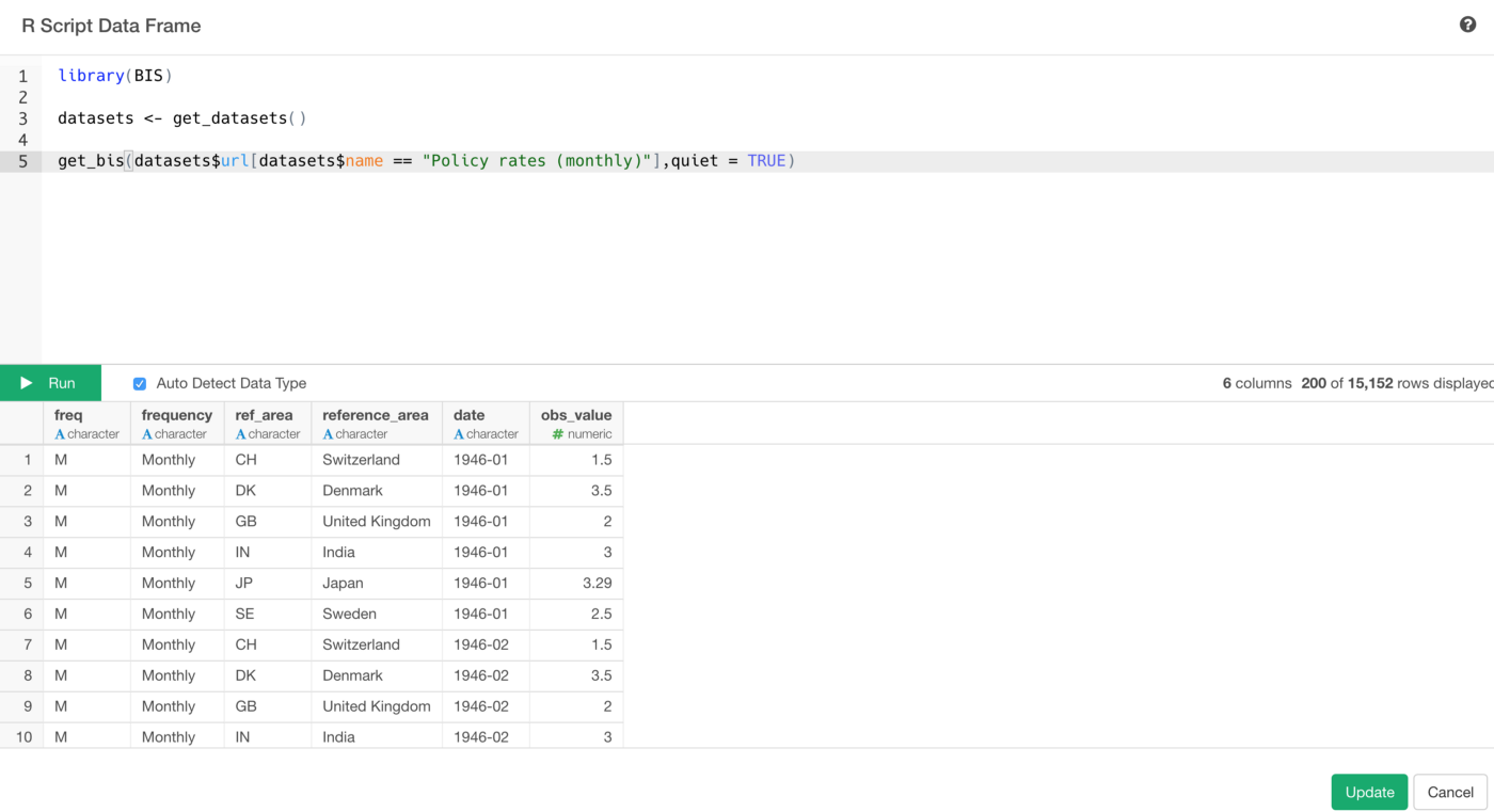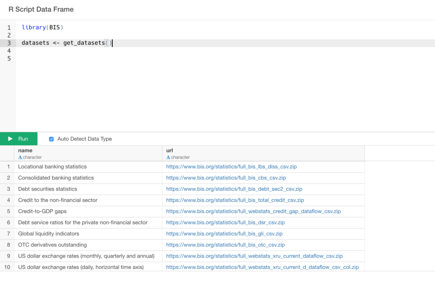 The get_bis function takes the URL from the data returned by get_datasetsfunction. You can copy and paste the URL value of the data set you are interested in or you can use the name value to filter the URL data like the above.